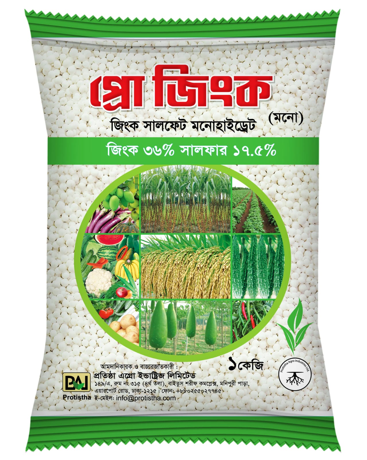 Zinc : 36% min Sulphur : 17.5% Min Water Soluble of Zinc as percentage of Zince Min : 95% Min Moisure Content (Free Water) Percentage by weight : 2% max Particles size 90% of the materials shall pass through 2-4 mm : 2-4 mm Physical Condition : Granuar Pack Size : 1 kg Maximum Retail Price ( MRP) : BDT 280 On Line Purchases 10% discount : BDT 252